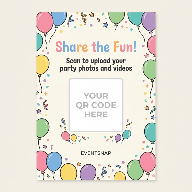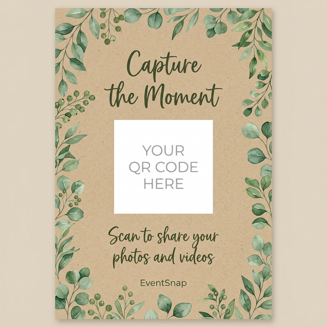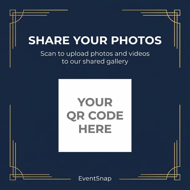Print on quality card stock and place on tables, at the entrance, or near the bar. Guests scan and upload!